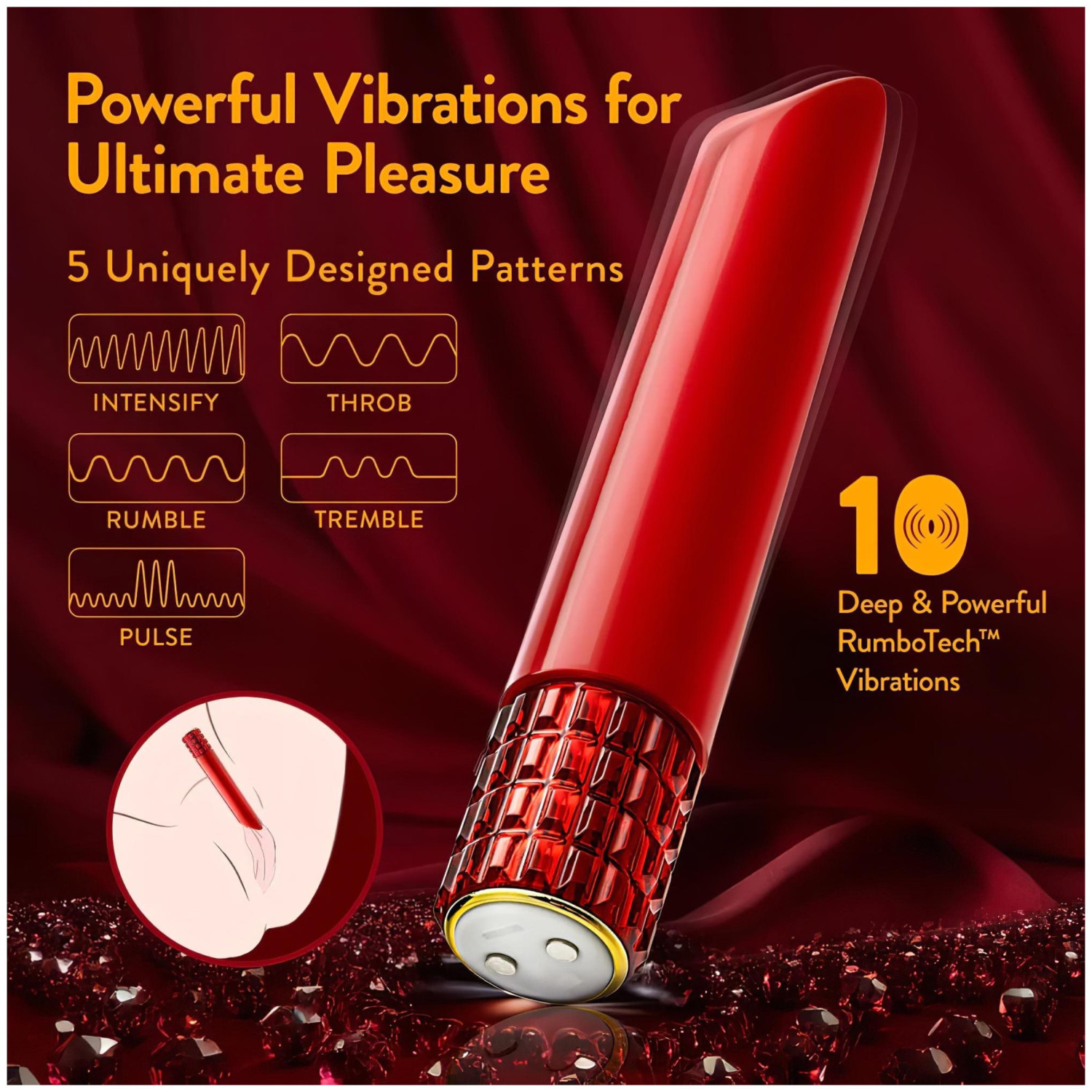 • Motor puternic: 10 moduri de vibrație (5 viteze + 5 modele) pentru experiențe variate.