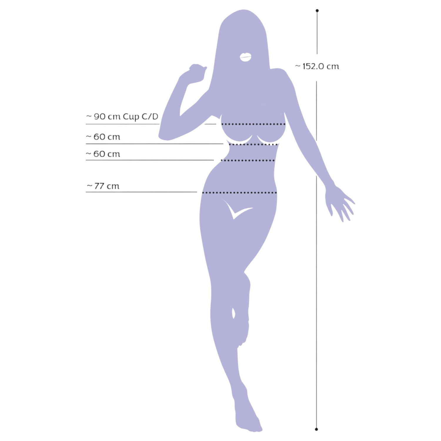 • Umeri: 90 cm, Talie: 60 cm, Șolduri: 77 cm